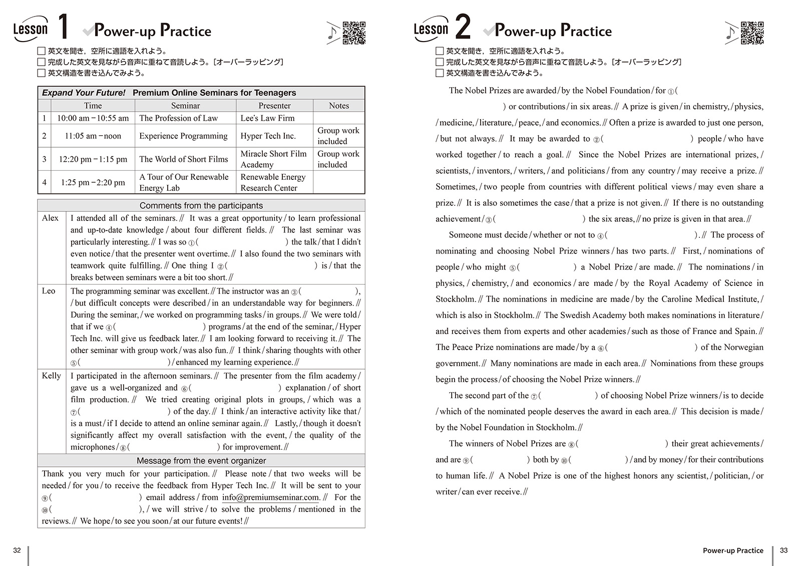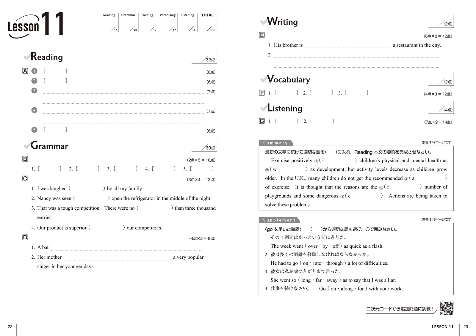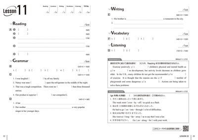 シリーズ全5冊、それぞれ1レッスン4ページ、全15レッスン構成の総合問題集です。中学修了レベルから大学入試基礎レベルまで、バランスよく総合的に英語の力を身に付けることができます。各レッスンは長文読解・文法・英作・語い・リスニングの5分野から成り、各分野で語句、表現、文法を繰り返し学習することによって学習効果を高めます。また、Power-up Practiceは、音読やディクテーションなど、学習者一人ひとりのニーズに合わせた、多様な学習活動に使用できます。